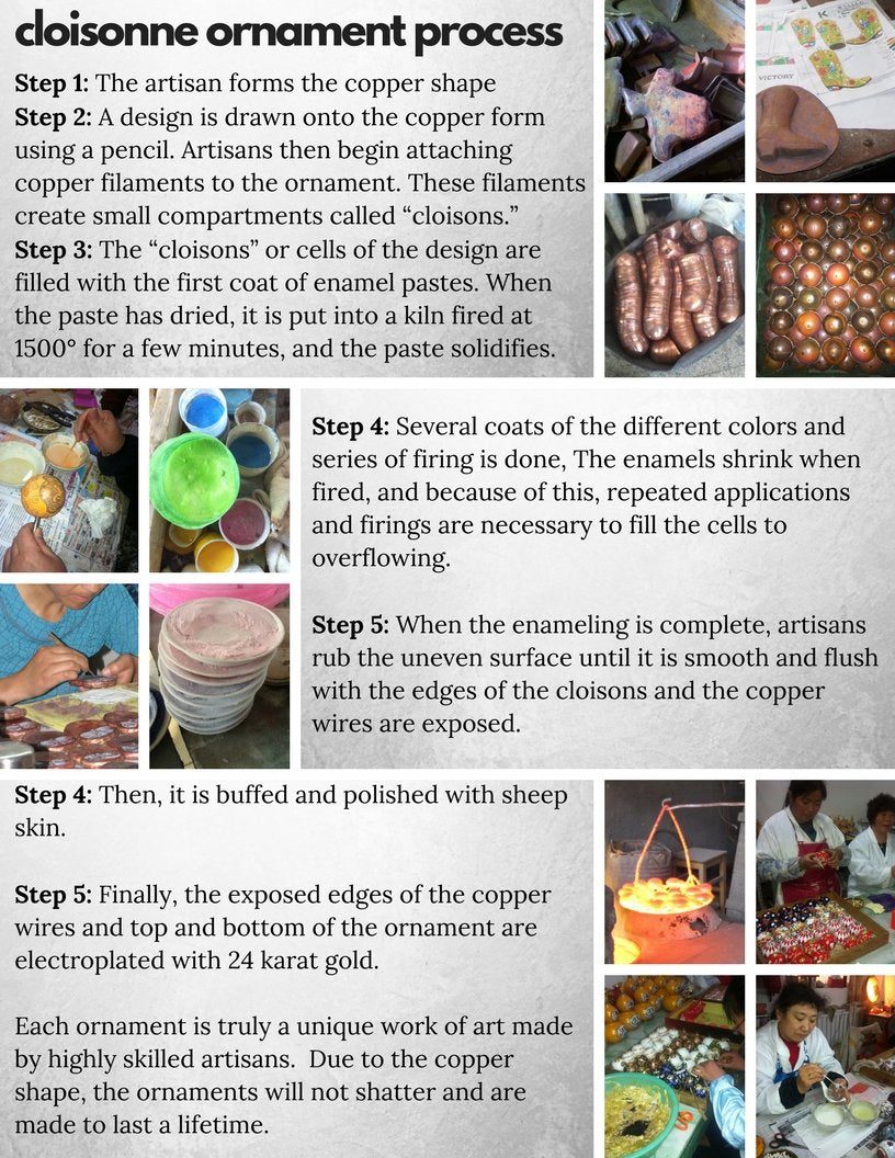 Created from copper molds and filaments, then "painted" with enamel paste and kiln fired at 1500º. The are unique, one-of-a-kind works of art. Hand-molded, painted, buffed, polished, and finally plated with touches of 24 karat gold.