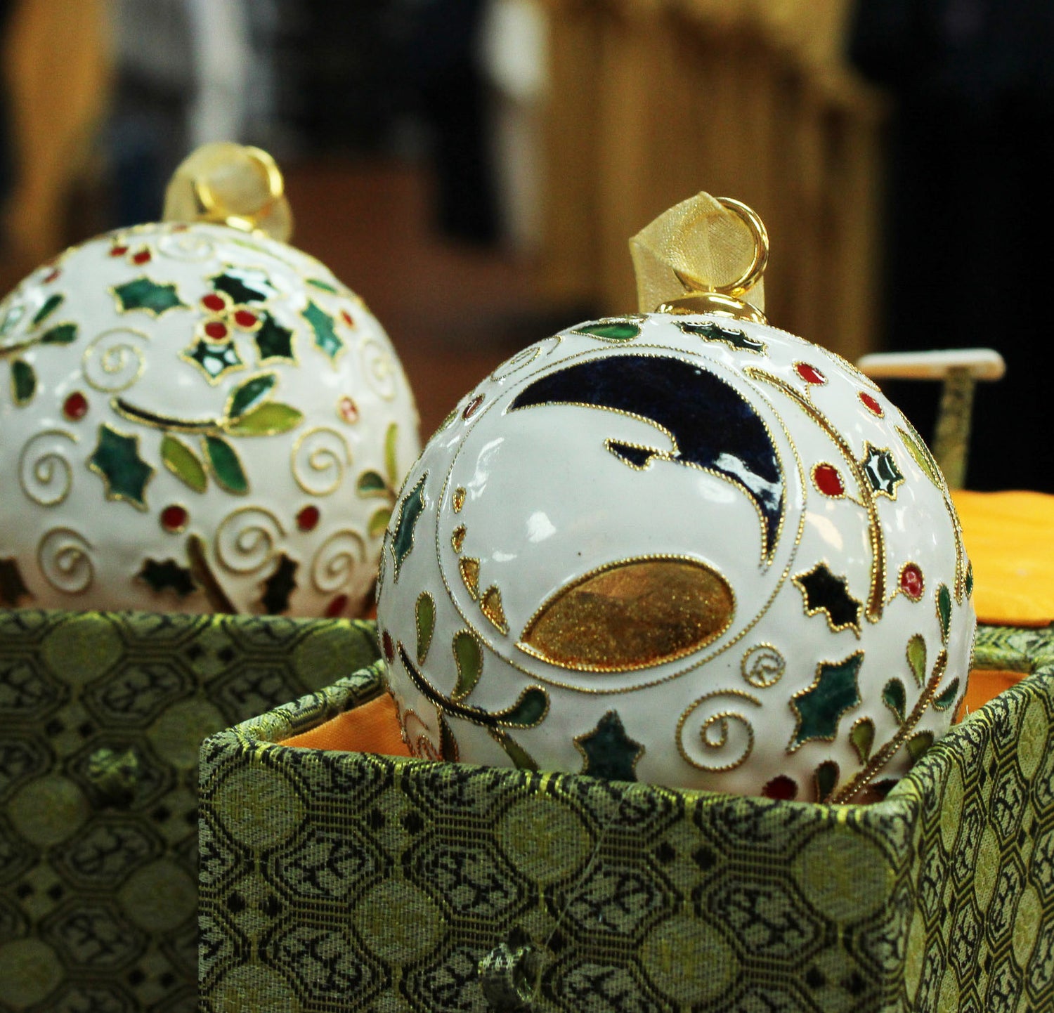 Created from copper molds and filaments, then "painted" with enamel paste and kiln fired at 1500º. The are unique, one-of-a-kind works of art. Hand-molded, painted, buffed, polished, and finally plated with touches of 24 karat gold.