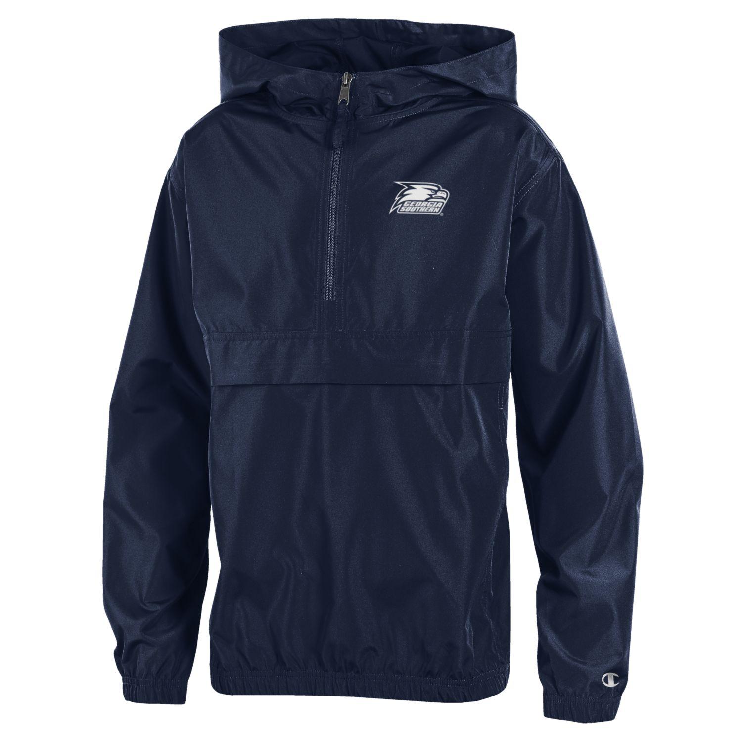 This youth sized 1/4 zip packable jacket from Champion is 100% polyester micro poplin fabric with a water RESISTANT coating. It is open at the bottom with a scuba collar and hood. It can be packed up into the front pocket.